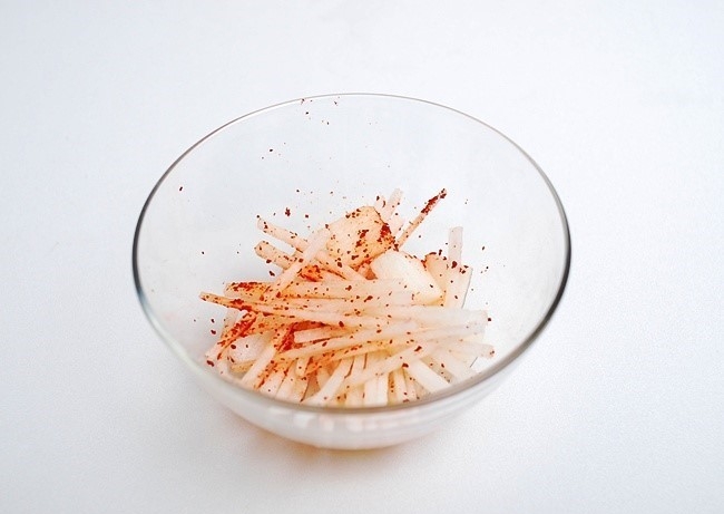 볼에 무, 배, 고춧가루를 먼저 넣고 가볍게 버무려 색을 먼저 입혀줍니다.